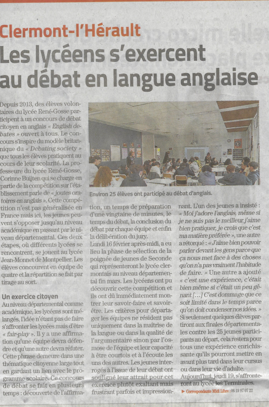 Les concours, seconde et cycle terminal niveau lycée ont eu lieu et 15 élèves représenteront notre lycée à la finale départementale du 27 mars prochain au lycée Jean Monnet de Montpellier, ils y retrouveront 17 établissements de l'Hérault .